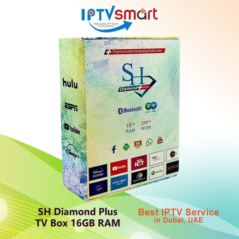 The SH Diamond Plus Android TV Box delivers a powerful and seamless entertainment experience with 16GB RAM and 256GB ROM, ensuring smooth multitasking and ample storage. Designed for high-performance streaming, it supports 8K Ultra HD resolution for stunning visuals. Equipped with dual-band Wi-Fi (2.4G & 5.8G) and Bluetooth connectivity, it ensures fast and stable wireless performance. Access your favorite apps, including YouTube, Netflix, Prime Video, and Disney+, for unlimited entertainment. The SH Diamond Plus is available in different flavors, including Standard, Advanced, and Pro Editions, catering to different viewing preferences. New SH Diamond Plus in Dubai